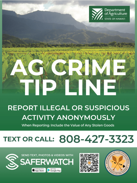 Agricultural crimes—including theft of livestock, equipment, or crops—cause significant losses for Hawaii’s farmers and ranchers. These crimes not only impact local food security and economy, but also the sustainability of island agriculture.