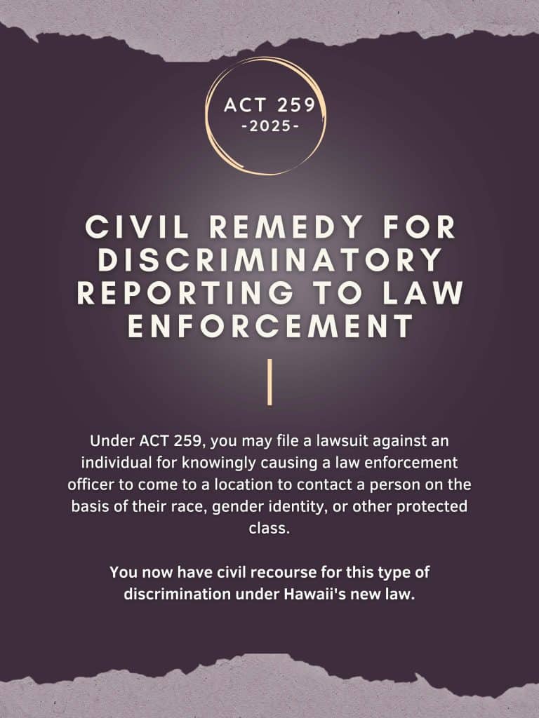 Hawai‘i’s new law — Act 259 — legislation aimed at preventing the misuse of emergency services to target individuals based on race, gender identity or other protected class officially went into effect across the state September 1, 2025. Signed into law by Governor Josh Green on July 1, 20225, Act 259 establishes a civil remedy for individuals harmed by discriminatory reporting to law enforcement.