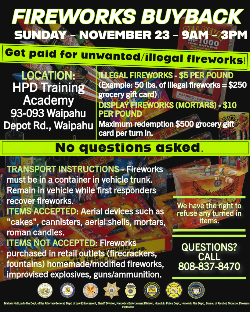 HONOLULU – The Honolulu Police Department (HPD), in partnership with the Department of the Attorney General, Department of Law Enforcement, Sheriff Division, Narcotics Enforcement Division, Honolulu Fire Department, and the Bureau of Alcohol, Tobacco, Firearms and Explosives, will be holding a Fireworks Buyback event to help the community safely dispose of unwanted or illegal fireworks.