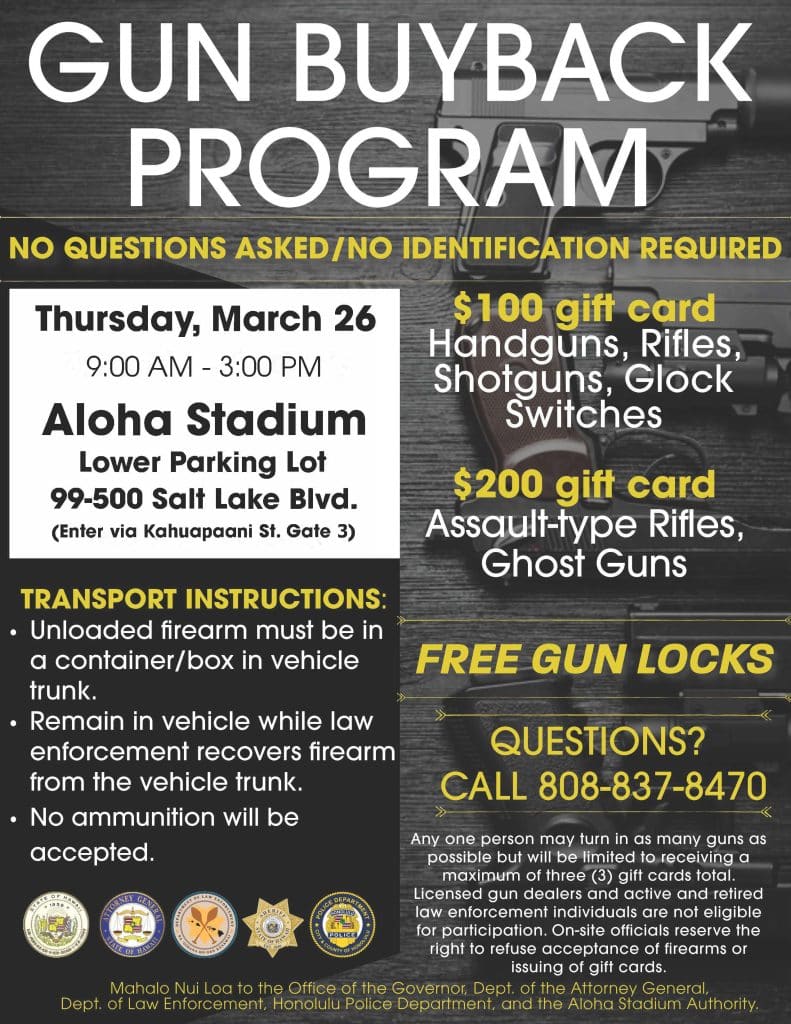 What: Department of Law Enforcement (DLE), in partnership with the Honolulu Police Department (HPD) and Department of the Attorney General, will be conducting a gun buyback event. No questions asked and no identification required. This gun buyback event gives households a safe avenue for firearms disposal.